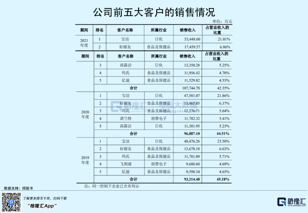 另外值得注意的是,报告期内,公司向前五大客户的销售金额分别为9.32亿元、9.69亿元和10.78亿元,占同期营收比例分别为45.18%、44.51%和42.35%,占比相对较高,存在客户集中度较高的风险。其中,公司第一大客户为宝洁,公司向其销售金额分别为4.85亿元、4.76亿元和5.34亿元,占同期营收比例分别为23.50%、21.86%和21.01%,公司对单一客户的依赖程度较高,一旦失去某个大客户公司或将面临业绩下滑的风险。