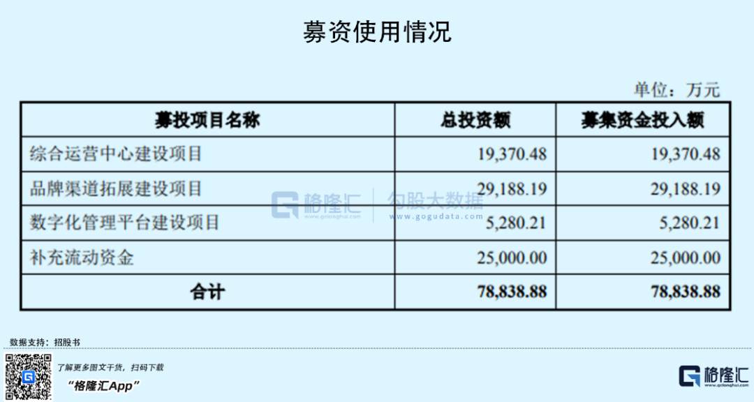 本次IPO拟募资7.88亿元,主要用于综合运营中心建设项目、品牌渠道拓展建设项目、数字化管理平台建设项目以及补充流动资金。