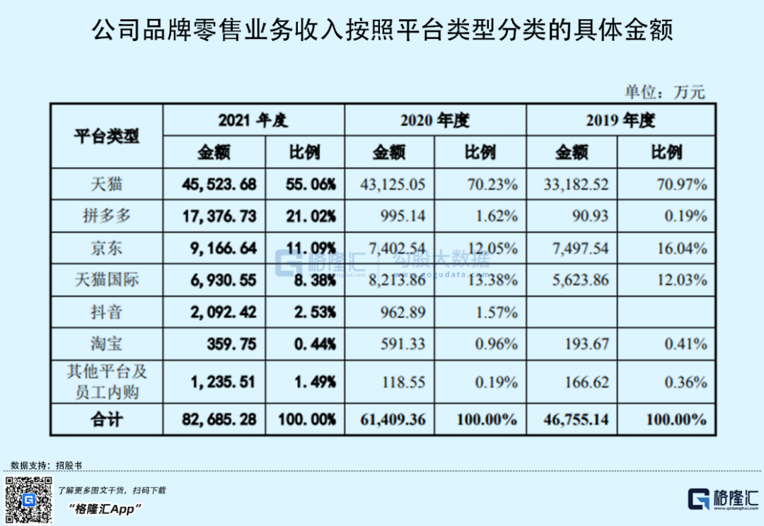 究及原因,主要系公司积极布局拼多多渠道,并大力发展渠道分销业务所致。报告期内,公司在拼多多平台的品牌零售业务收入占比由 2019年的 0.19%升至 2021 年的 21.02%,而拼多多平台主打性价比,其平台毛利率低于天猫和京东。