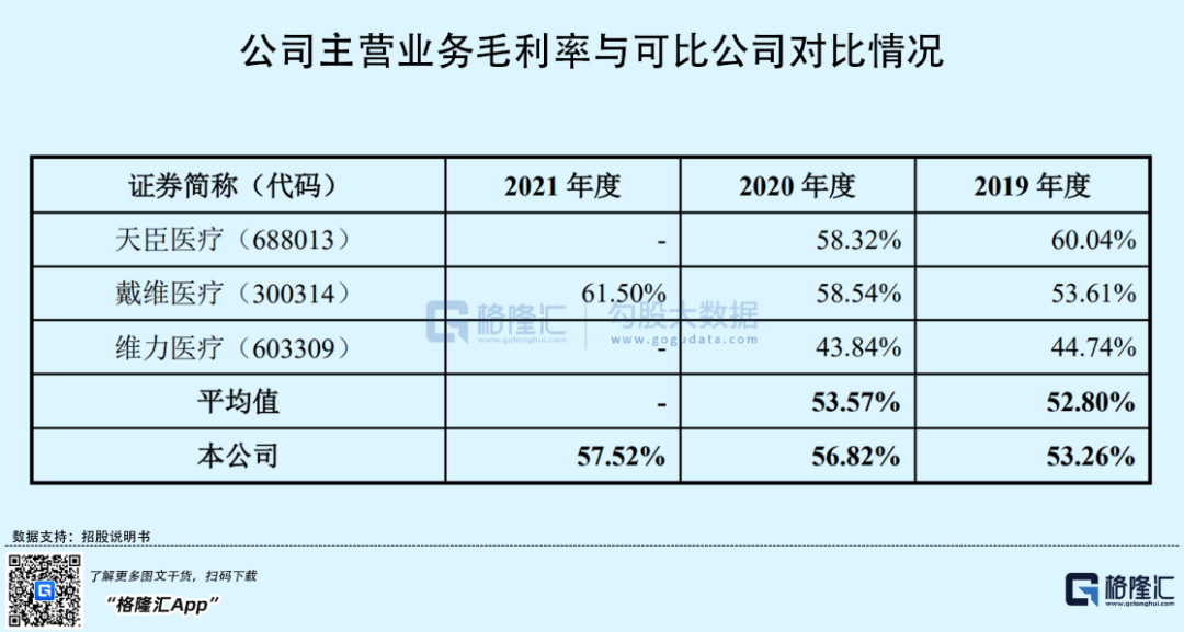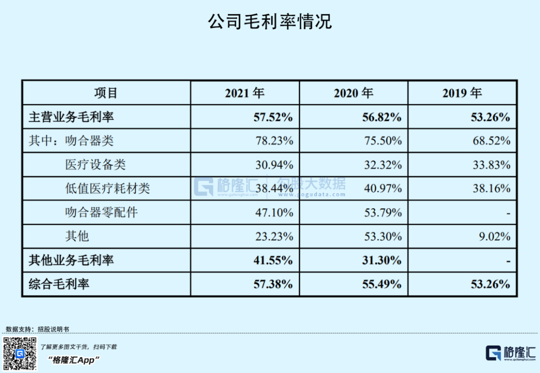 目前公司的毛利率还处于同行业的中等水平,2020年公司新增的吻合器零配件业务毛利贡献较高,且2021年毛利率相对较高的腔镜吻合器收入占比提高,使得公司综合毛利率实现稳步提升,期间内从53.26%上升至57.38%,不过未来在“带量采购”政策进一步推行后,公司存在毛利率大幅下滑的风险。