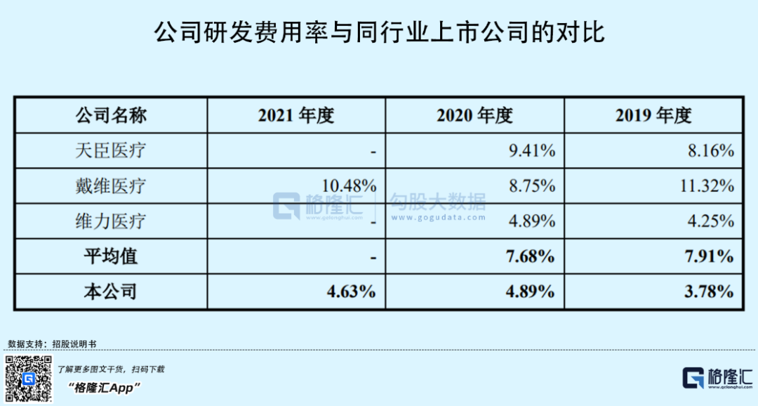 值得注意的是,东星医疗原本的收入主要来自于外科手术设备和低值耗材的代理业务,直到收购了威克医疗,公司才具备自有产品,公司的关键技术也是来源于此,因此公司与那些靠自身技术研发发展起来的企业在研发能力方面具有一定的差距。不过在此背景下,公司在研发方面的投入也并不算积极,近三年公司研发费用仅为 1118.06 万元、1832.42 万元和 2067.41 万元,分别占当期营业收入的3.78%、4.89%和 4.63%,虽然投入金额有所增长,但研发费用率远低于同行业平均水平。