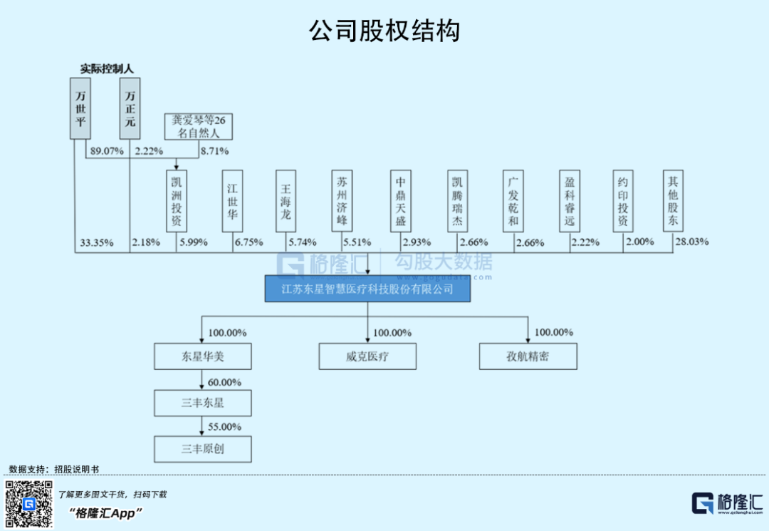 截至目前,东星医疗的控股股东为万世平,其直接持有公司33.35%股份,通过凯洲投资间接控制公司5.99%的股权,并与其子万正元合计控制公司41.51%的股份,为公司的共同实际控制人。