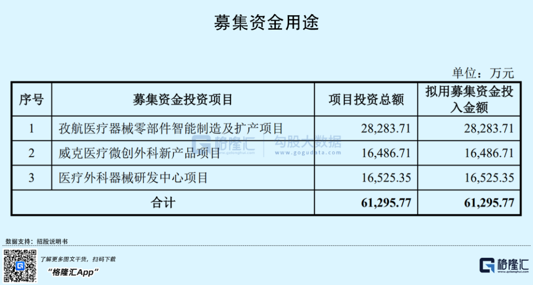 本次发行上市,公司拟募集6.13亿元,用于孜航医疗器械零部件智能制造及扩产项目、威克医疗微创外科新产品项目以及医疗外科器械研发中心项目。