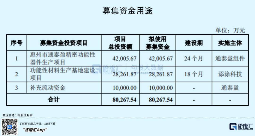 本次IPO拟募资8.03亿元,主要用于惠州市通泰盈精密功能性器件生产项目、功能性材料生产基地建设项目、补充流动资金。