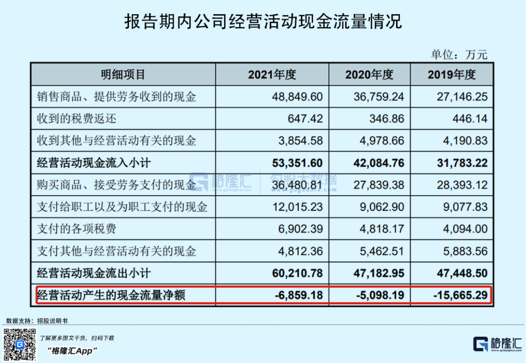 值得一提的是,报告期内,公司经营活动现金流量净额分别为-1.57亿元、-5098.19万元及-6859.18万元,连续三年均呈现流出状态。随着公司经营规模的不断扩大,公司营运资金需求日益增加,公司经营活动现金流量净额持续为负可能导致公司出现流动性风险。