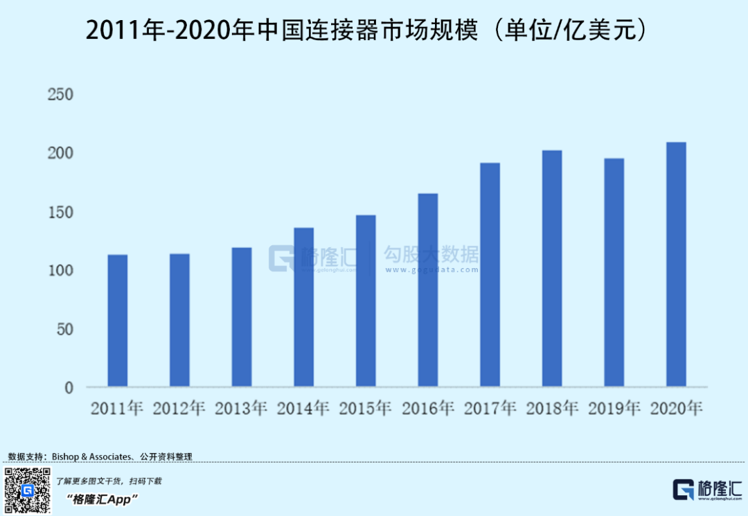 近年来,由于国内下游产业快速发展,使得中国连接器市场一直保持高速增长,据统计,我国连接器市场份额由2011年的113亿美元增长至2020年的约201.8亿美元,占全球市场的比例由23.10%提升至32.18%,成为全球第一大连接器消费市场。