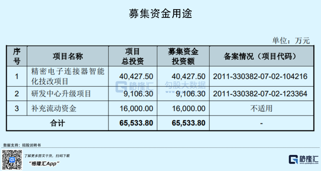 本次在创业板申请IPO,公司拟募集6.55亿元,其中4.04亿元用于精密电子连接器智能化技改项目,其余资金将用于研发中心升级项目以及补充流动资金。