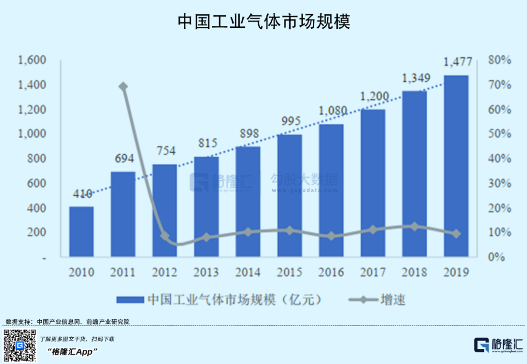 随着改革开放推进,中国工业气体行业在80年代末期已初具规模,到90年代后开始快速发展。数据显示,中国工业气体市场规模由2010年的410亿元增长至2019年的1477亿元,增速稳定在10%左右,华泰证券预计,到2022年,该市场规模有望达到近300亿美元,折合人民币接近2000亿元。