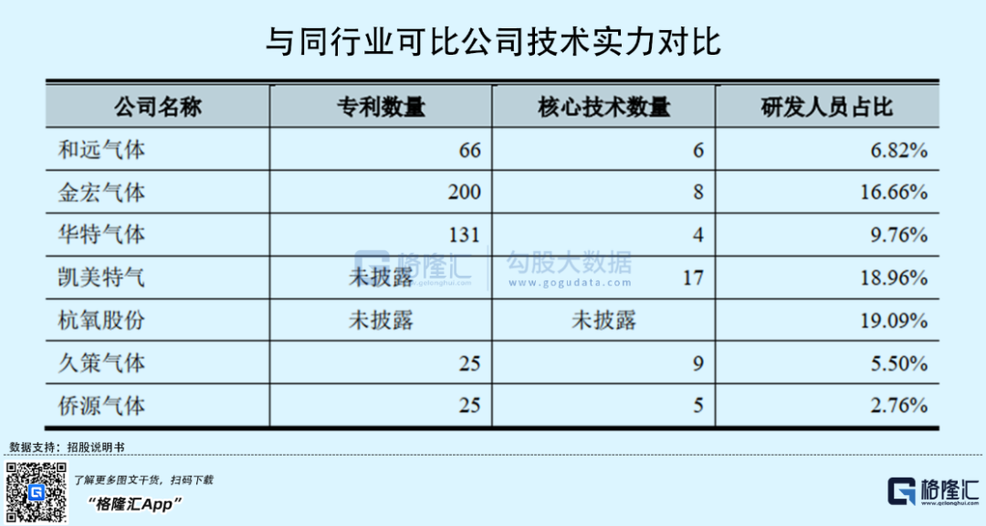 与此同时,侨源气体在“硬技术”方面也不如同行。可以看到,公司在研发人员占比仅2.76%,同行中杭氧股份、凯美特气、金宏气体的研发人员占比达到15%以上。不仅如此,在专利数量方面,公司亦处于垫底地位,目前仅有25项实用新型专利,并无发行专利,而金宏气体、华特气体、和远气体的2021年底专利数分别为255项、147项、78项,其中发行专利分别有43项、20项、6项。