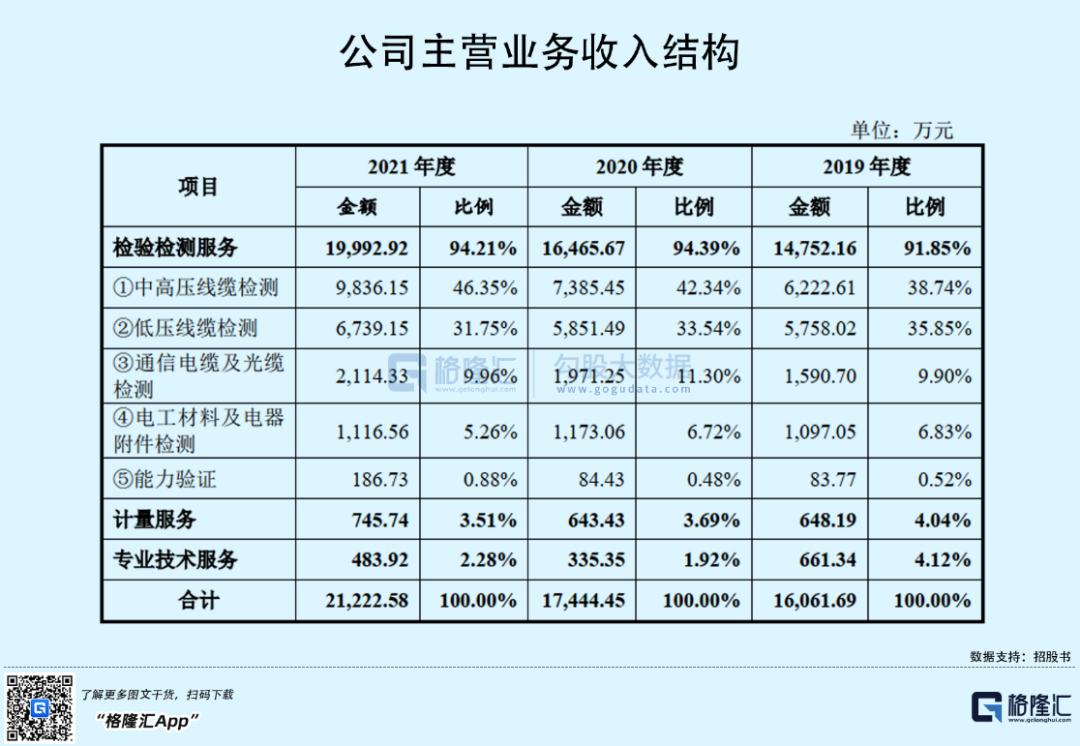 其中,电线电缆及光纤光缆检验检测业务贡献收入绝对大头,收入占主营业务收入的比例逐年增长至88%。而专业技术服务目前业务规模仍然较小。