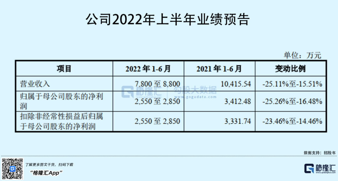 可以看到,公司预计2022年上半年实现营收同比下滑15.51%-25.11%至7800万元-8800万元,归母净利润则同比下滑16.48%-25.26%至2550万元-2850万元。