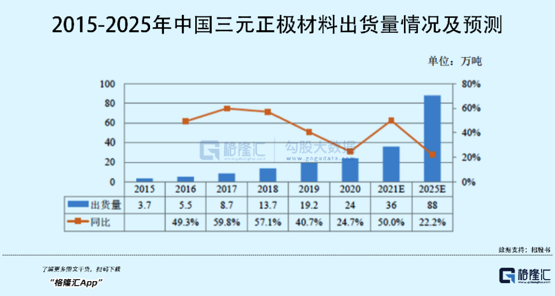 众所周知,三元材料是锂电池正极材料的重要发展方向,近年来新能源汽车大热,叠加电动工具及锂电自行车市场需求呈现爆发式增长,三元电池及三元正极材料愈发有存在感 (预计未来五年,三元正极材料市场出货量有望保持29.7%的年复合增长率,到2025年出货量将到 88万吨),也为入局标的带来了直接利好。