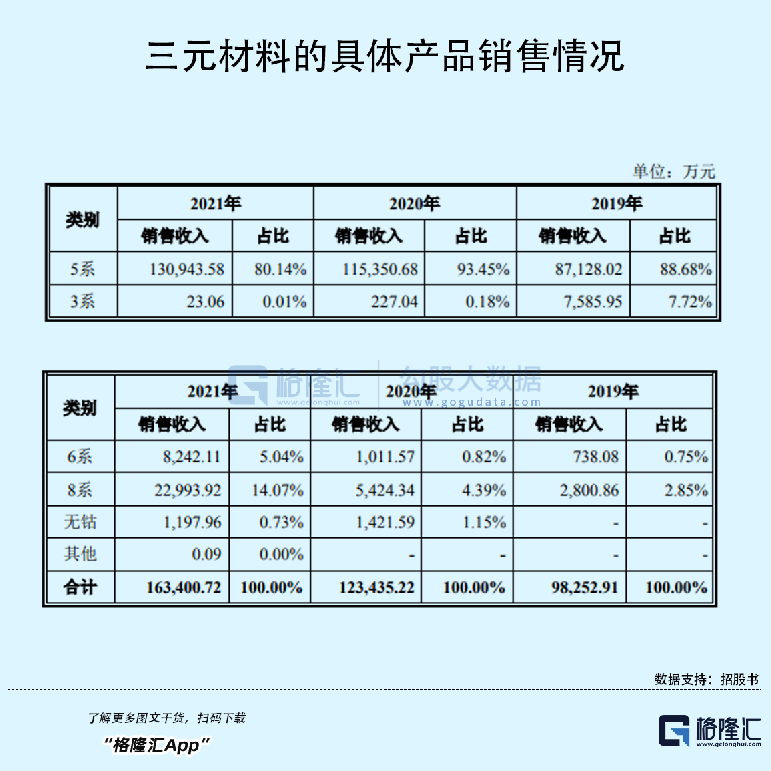 按具体产品划分,天力锂能的5系三元材料产品主要用于电动自行车、电动工具领域,是公司销售收入的主要来源,其销售占比较高;3系产品2019年主要向银隆新能源销售,2020年及2021年销售较少;公司针对核心客户开发出FEXT-01产品,具有较好的性价比优势,导致6系产品2021年销量增加较多;8系产品增长较快,在新能源汽车及高端电动工具领域得到了客户的认可。