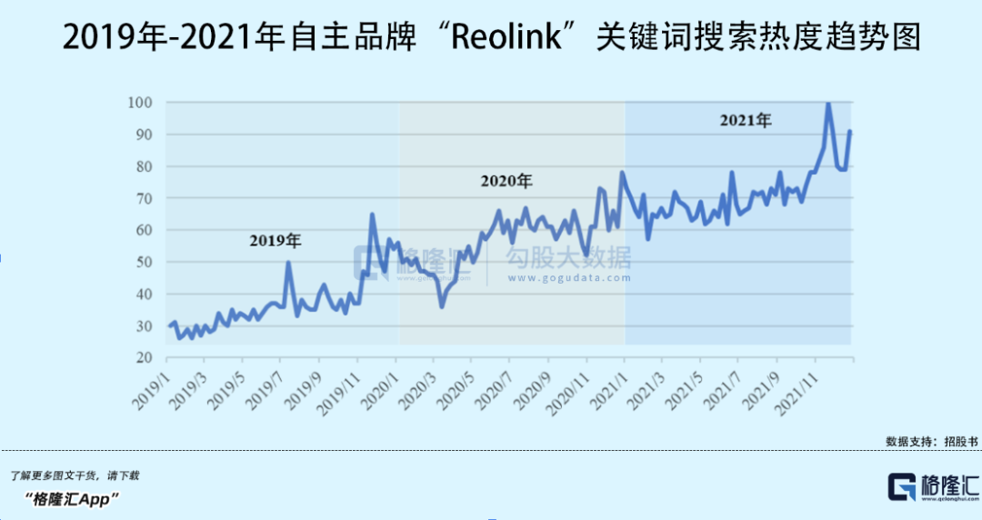 报告期内,公司投入销售费用逐年提升,由2019年的2.1亿元增至2021年的3.4亿元。效果也显而易见,“Reolink”关键词的搜索热度大幅提升,越来越多潜在消费者关注到公司产品,一定程度带动了产品销量增长。