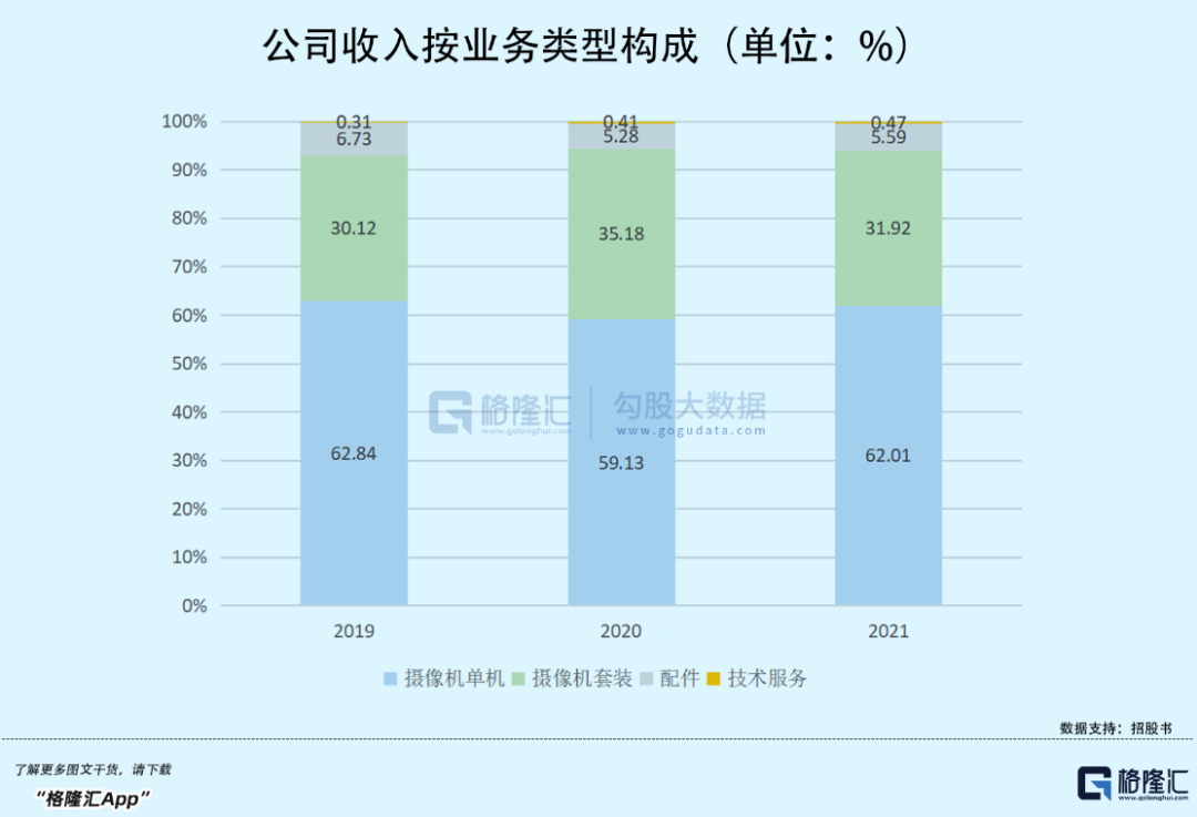细分来看,摄像机单机是睿联技术的主要收入来源,报告期内保持在60%左右,其次是摄像机套装,销售占比超过30%。