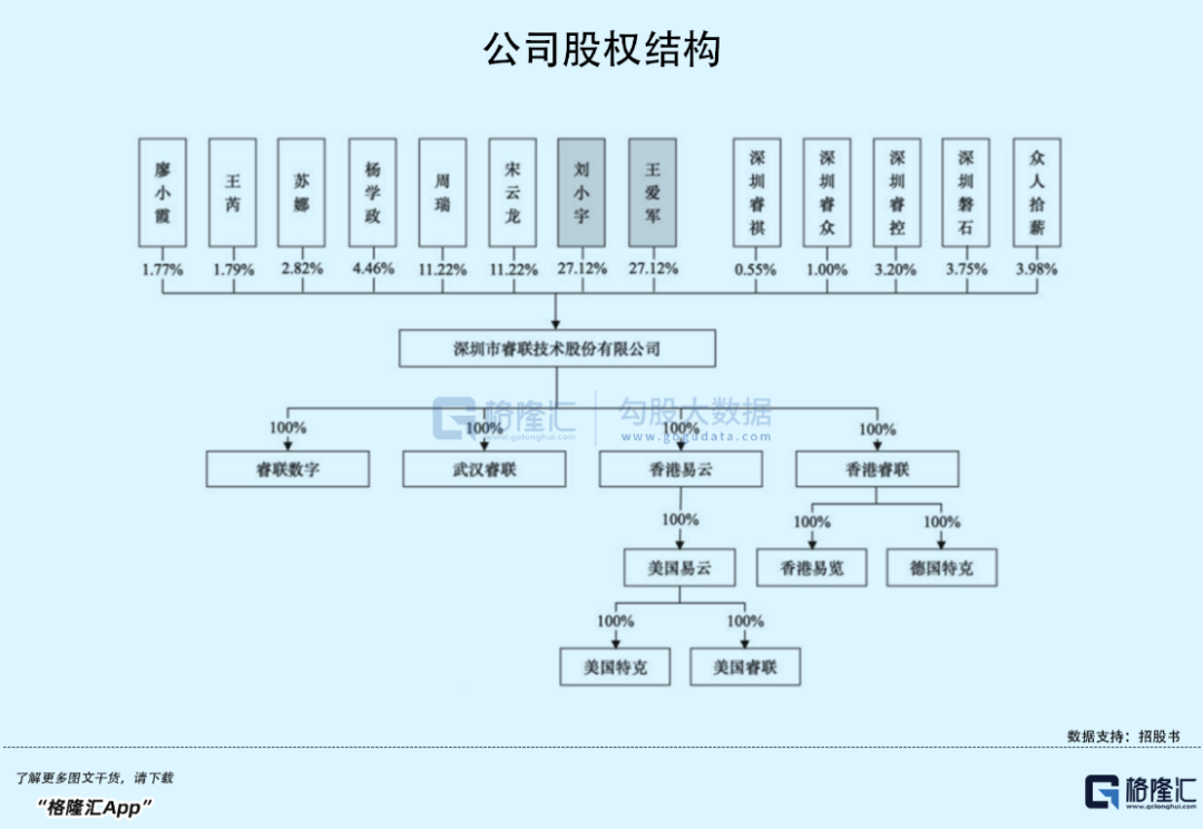 自2009年成立以来,睿联技术经历了多次增资、股权转让、股份制改革,注册资本从最开始的10万元增至9000万元。截至招股书签署日,刘小宇、王爱军分别持有公司27.12%的股权,合计持股54.24%,为睿联技术的控股股东、实际控制人。