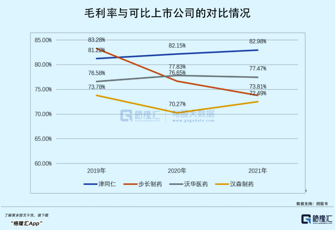 经营成果方面,2019年-2021年津同仁的营收由7.44亿元增长至10.12亿元,对应的归母净利润由1.51亿元增至1.91亿元;公司主营业务毛利率维持在80%以上,高于可比公司平均水平。