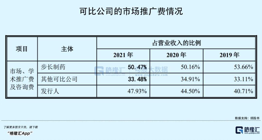 报告期内,公司销售费用分别为3.54亿元、4.01亿元、5.15亿元,金额逐年上升,其中9成以上为市场推广费用,其占营收的比例由40.71%增至47.93%,仅低于步长制药,远高于其他可比公司。