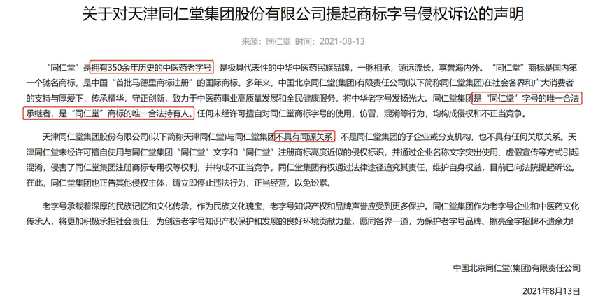 2021年8月,北京同仁堂正式向津同仁发起商标侵权诉讼,要求津同仁赔偿5000万,并立即停止使用“同仁堂”商标,表示同仁堂集团是“同仁堂”字号的唯一合法继承者,是“同仁堂”商标的唯一合法持有人,津同仁与同仁堂集团不具有同源关系。