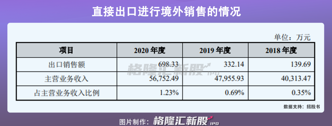 报告期内,公司直接出口的销售额仅为139.69万元、332.14 万元、698.33万元,占当期主营业务收入的比例仅为0.35%、0.69%、1.23%。