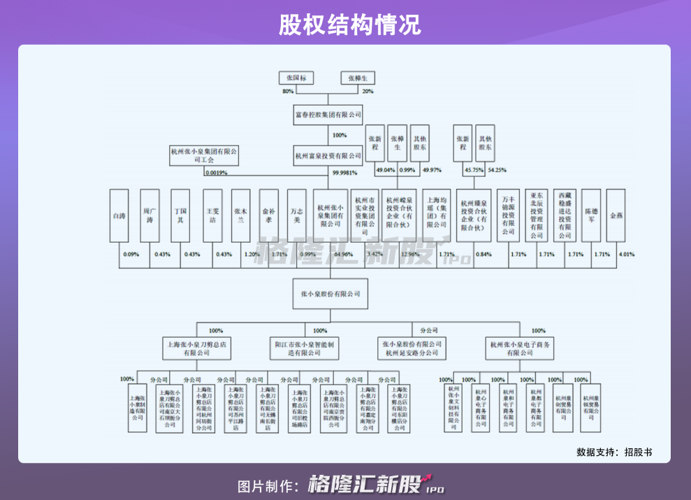 张小泉目前是一家集设计、研发、生产、销售和服务于一体的现代生活五金用品制造企业。根据股权结构,目前张小泉股份有限公司的控股股东为张小泉集团,实际控制人是张国标、张樟生和张新程,三人通过富春控股、嵘泉投资和臻泉投资共持有公司71.83%的股份。