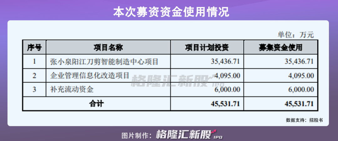 本次募资资金4.55亿元,将全部用于张小泉阳江刀剪智能制造中心项目、企业管理信息化改造项目等公司主营业务相关的项目。