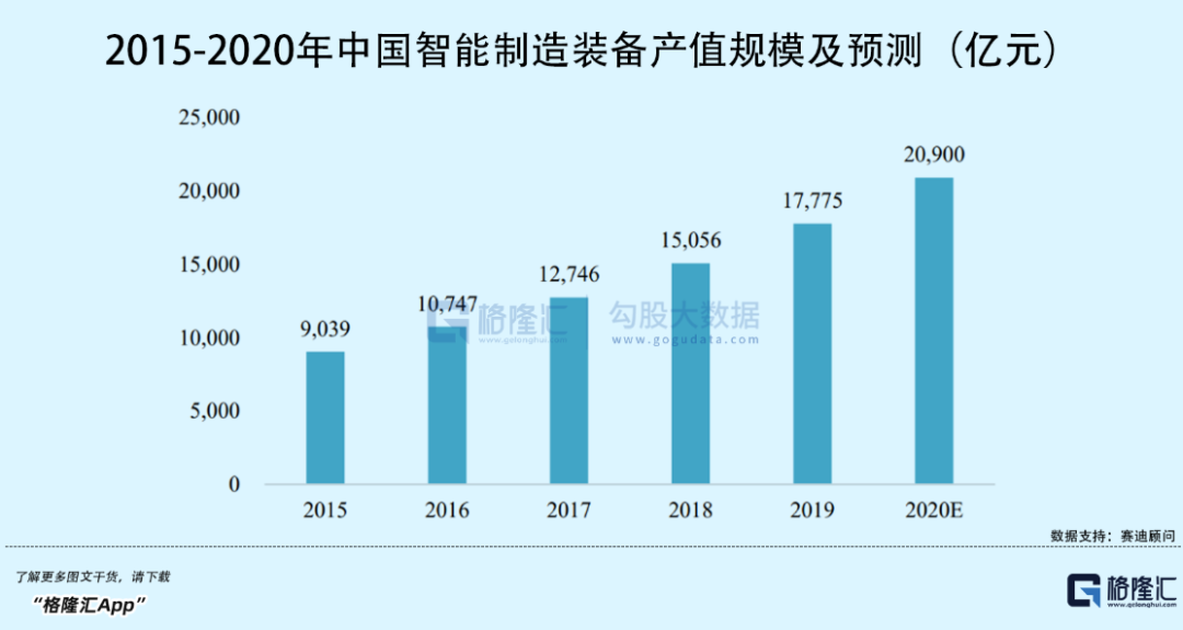 2015年-2019年,我国智能制造装备产业保持较快的增长趋势,年复合增长率高达18.42%,2020年我国智能制造装备产业的市场规模将超2万亿元。