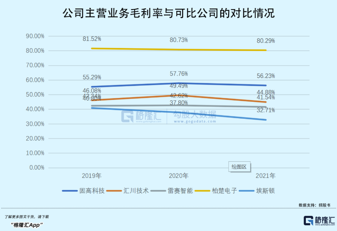 报告期内,公司的主营业务毛利率维持在55%以上,其中运动控制器的毛利率高达66%,由于业务结构及产品特点存在一定的差异,固高科技的毛利率高于汇川技术、雷赛智能、埃斯顿,低于柏楚电子。