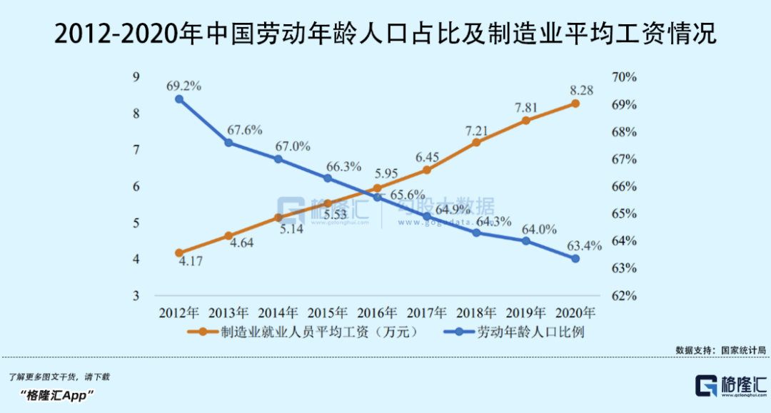 近年来,中国劳动年龄人口占比与制造业平均工资情况形成了“剪刀差”。