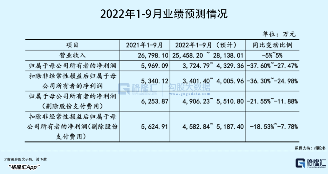 2022年1-9月,预计公司营收为2.55亿元至2.81亿元,同比变动-5%至5%;预计归母净利润为3724.79万元至4329.36万元,同比变动-37.6%至-27.47%,剔除股份支付的影响,公司扣非后归母净利润仍下滑约-18.53%至-7.78%。