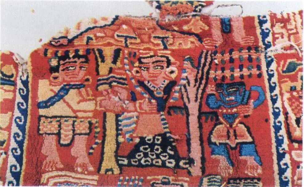 2号毯(图2),红地人物纹栽绒毯。长220、宽119厘米。残破较严重。该毯边框、纹样与1号毯相似。毯面中央有5排15身人物图像。图2-1为2号毯上保存完整的第二排3身人物图像;人物以高大的树木相隔。左边男子头戴花帽,佩耳环,身着黄色上衣,斜挎蓝色带,穿短裤,赤脚而立。中间女性佩耳环、项链和腕镯,穿V字领短上衣,两色宝塔形长裙。右边为一蓝肤色小孩,双手上举,着红色短衣,赤脚。