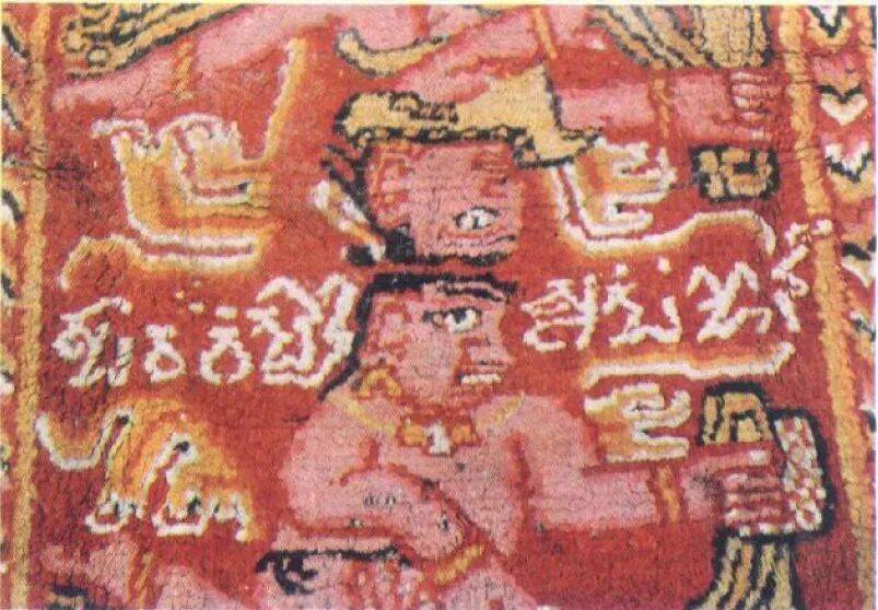 4号毯(图4),方形红地带翼人物纹栽绒毯。长114、宽119厘米。边框及纹样与3号毯相似。毯中央人物图像上女下男,头顶相连,均有双翼,手持长带,男女人物图像之间织有黄色的婆罗谜字母于阗文,转写如下:Spāvatä meri sūmä hoḍä,意为“将军Meri献给苏密(月天)”。图4-1是4号毯中部的于阗文文字特写。
