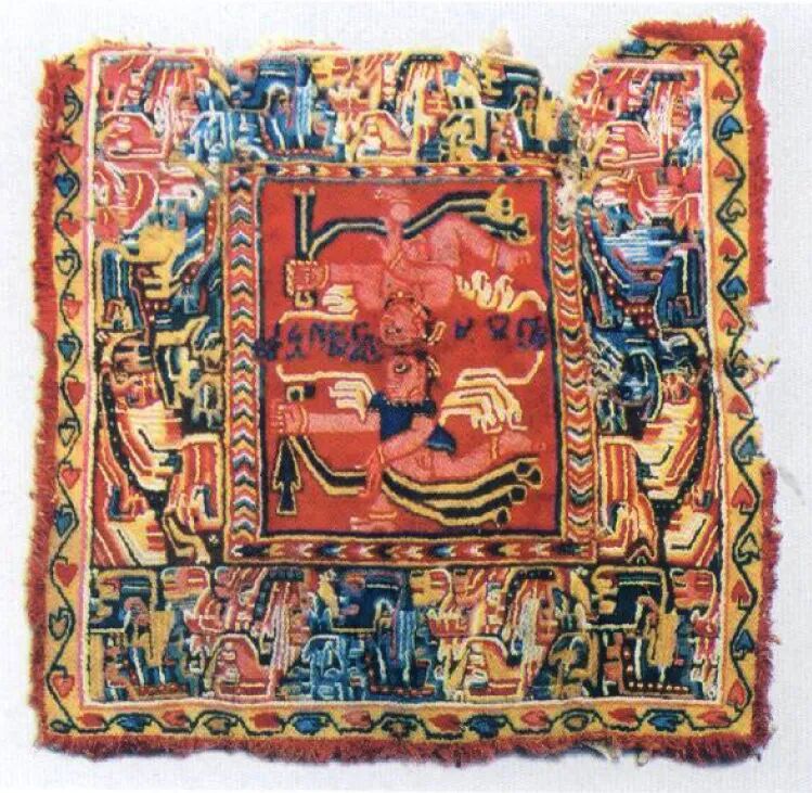 3号毯(图3),方形红地带翼人物纹栽绒毯。长123、宽119厘米。毯背后缝有两层白毡。从外向里共有3层边框:外层边框纹样为藤枝莲叶纹,主边框内充斥变体动物纹,内边框由三角纹图案构成。毯面中央为带翼男女人物图像,上男下女,头顶相连,两人均作奔跑状,双手持长带,男子全裸,女子身着蓝色短上衣。两身人物之间织有蓝色的婆罗谜字母于阗文,转写如下:Spāvatä meri sūmä hoḍä,意为“将军Meri献给苏密(月天)”。
