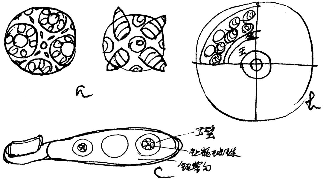 镶嵌玻璃珠是在像绿松石那种颜色—青绿色的玻璃珠上再镶嵌各种颜色、小大不同的小玻璃珠,并使之组成非常美观的各种花纹。这种玻璃珠在河南洛阳(韩)、辉县(魏)和湖南长沙(楚)、湖北随县(曾)的战国墓中都有发现(图1:a)。湖北云梦秦墓中,还发现了它的仿制品。更值得注意的是,洛阳金村战国墓中曾发现一件背面镶嵌玉环和上述那种美观的玻璃珠的铜镜(图1:b)。解放后,在河南辉县固围村的战国墓中发现镶嵌玉璧和这种玻璃珠的银带钩(图1∶c)。这几件器物,表明这种新式的玻璃珠传入不久,我们的工匠就把它像过去使用绿松石一样装饰到金属器物上去了。