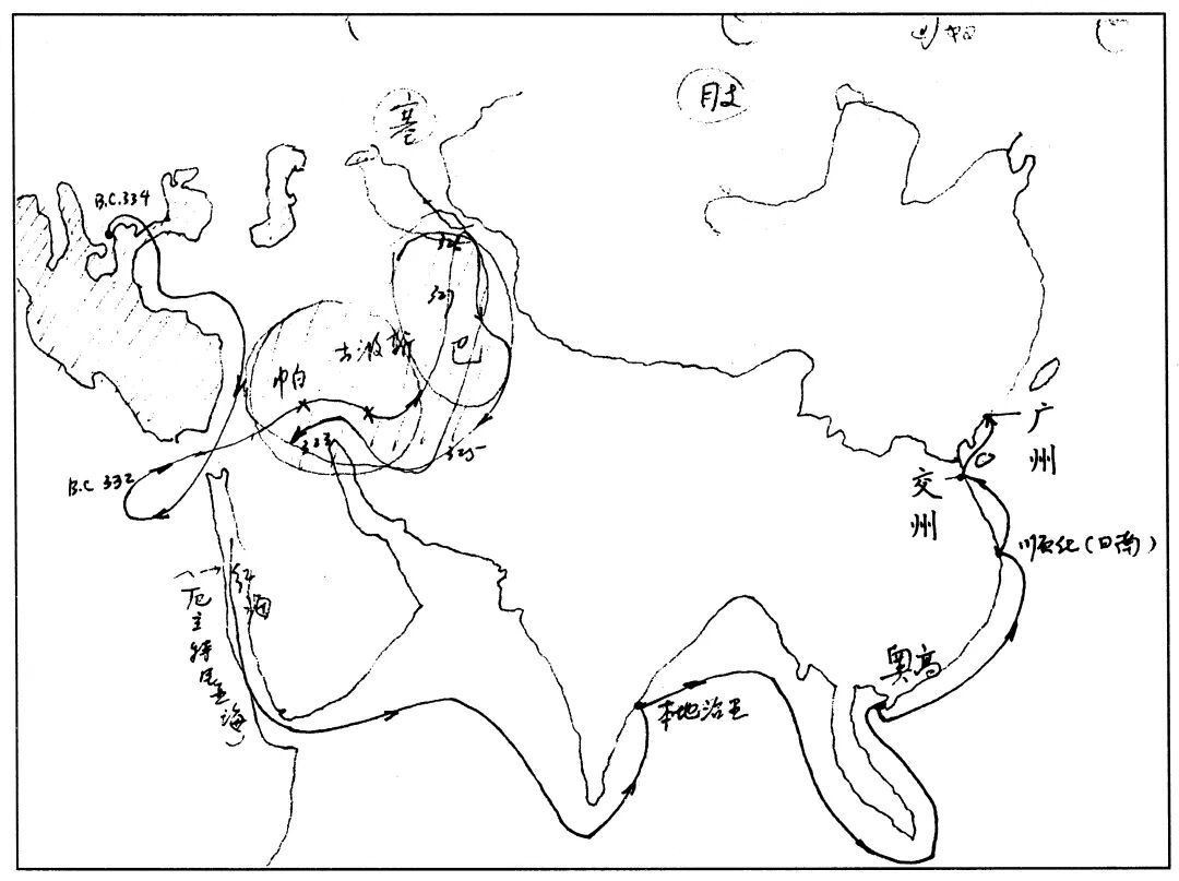 在西亚是古波斯帝国(阿契美尼德王朝)的后期,前334年马其顿—希腊王亚历山大东侵,前332年攻下埃及,前331年攻占两河流域,前331— 前330年侵据了古波斯帝国的两个都城—苏萨和波塞波利斯,然后又引兵向东北,前327年攻占了巴克特里亚(大夏),前326年又向北进入索格底(粟特)区域,越过了阿姆河(妫水,乌浒河),攻下索格底的中心撒马尔干,前326年一直向北侵略到锡尔河(药杀水),这样就侵据了古波斯帝国的全部领域,北边就和塞人的游牧区相毗邻。之后转向南抵印度河流域。前 325年被迫回师,前323年死去。亚历山大死后,马其顿—希腊分裂。西亚地区由亚历山大的将领塞琉古统治,前312年建立由希腊人统治的塞琉古王朝,即我国历史上所记的条支。在亚历山大东侵以后和塞琉古王朝的前期,大量希腊人移居东方,在许多地点建立了希腊式的城市。考古发现距我国最近的一座是在今阿富汗西北、阿姆河畔的埃伊哈努姆。这个希腊式的城址是1965—1968年发现和发掘的(阿、法合作),城址东西6—7公里,南北8公里,以官衙、神殿为中心,围绕半圆形剧场、体育场和住宅,出有希腊文石刻、希腊石雕等,是一座典型的希腊小城市,它的时代应在前300年前后。1973年出版了发掘报告。这本报告是我们了解战国时期和我国最近的中亚地区的希腊文化遗址的主要资料。前128年张骞到大夏时,这个希腊城市还存在,由他经行的路线看,他有可能到达了这里,因为这个城市距大夏都城蓝氏城不远。蓝氏城即马扎里沙里夫,在这个城市西北不过200多公里。前3世纪中期,塞琉古王朝的东部独立了两个国家:巴克特里亚(大夏)独立了,它的西边还独立了一个帕提亚(安息)。巴克特里亚(大夏)虽然独立了,但他的统治集团还是希腊的势力,当然也要包括东支伊兰语族的巴克特里亚人的上层。帕提亚是北支伊兰语族的游牧民族南下建立的国家。帕提亚在西,巴克特里亚在东。巴克特里亚的北邻是塞人,塞人东面就和河套以西的月氏接近了。巴克特里亚的东边到了葱岭西麓,和居住在当时新疆的各民族相毗邻。从这样的地理位置可以估计,当时中西文化交流,在中间的雅利安系统的游牧民族和畜牧民族所起的作用要比匈奴重要,以前葱岭东边的玉和葱岭西边的绿松石、玻璃大约仍然靠他们向东运输。