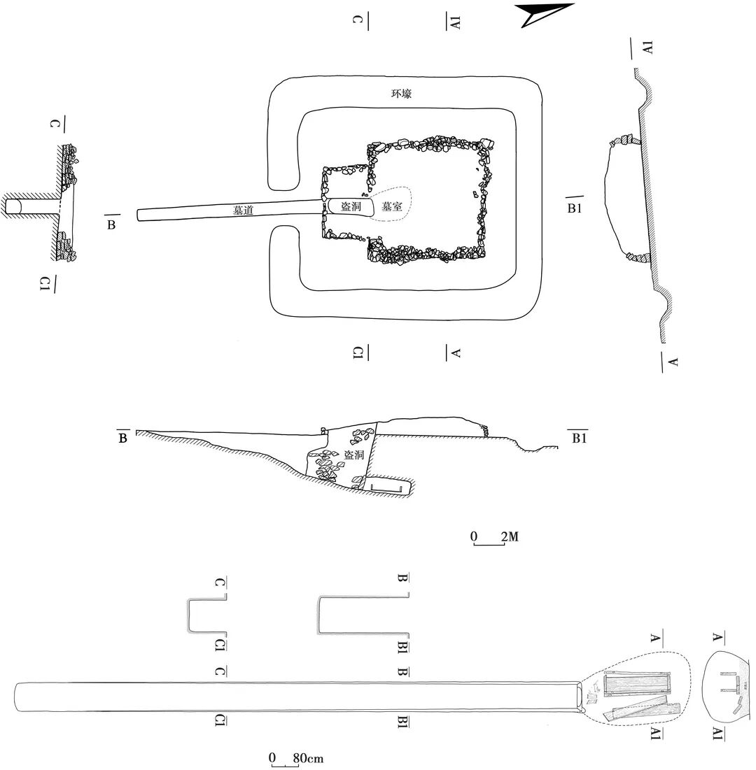 根据地表石块封堆建筑结构特征,墓葬可分为方形和圆形两种。方形石堆墓整体规模较大,平面略呈长方形,其在西侧的Ⅰ区分布最多,也较为集中,其次是东侧的Ⅲ区;圆形石圈墓一般规模较小,石圈直径在6~10米之间,在Ⅱ区分布较多,Ⅰ区和Ⅲ区也有少量分布。根据目前已经发掘的21座墓葬地下墓室结构的不同,可分为带墓道的洞室墓、竖穴土坑墓、竖穴土坑横洞室和竖穴土坑竖洞室墓四种形制。