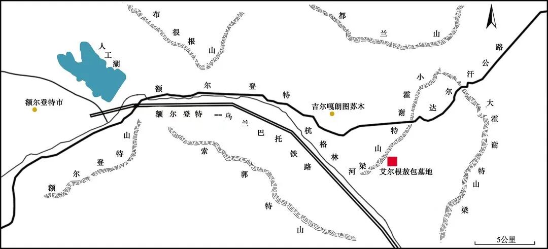 艾尔根敖包墓地位于蒙古国鄂尔浑省吉尔嘎朗图苏木东南约7公里处的小霍谢特(Hushuut)山梁东南侧,西北距额尔登特(Erdenet)市32公里,东南距乌兰巴托(Ulaanbaatar)210公里,北侧4公里处为额尔登特—达尔汗(Darkhan)公路,西南4公里处有乌兰巴托—额尔登特铁路。小霍谢特山梁为东北—西南走向,南端由五座相连的低矮山峰组成,山峰东南侧低洼处多长波叶大黄草(Ayiragiin evsu),蒙古语称之为“艾尔根”,意为酸草,山峰顶部有当地牧民祭拜天地的敖包,被称为“艾尔根敖包”(Ayiragiin ovoo),墓地即以此命名。地理坐标为北纬49°00′7936″,东经104°30′7630″(图1)。