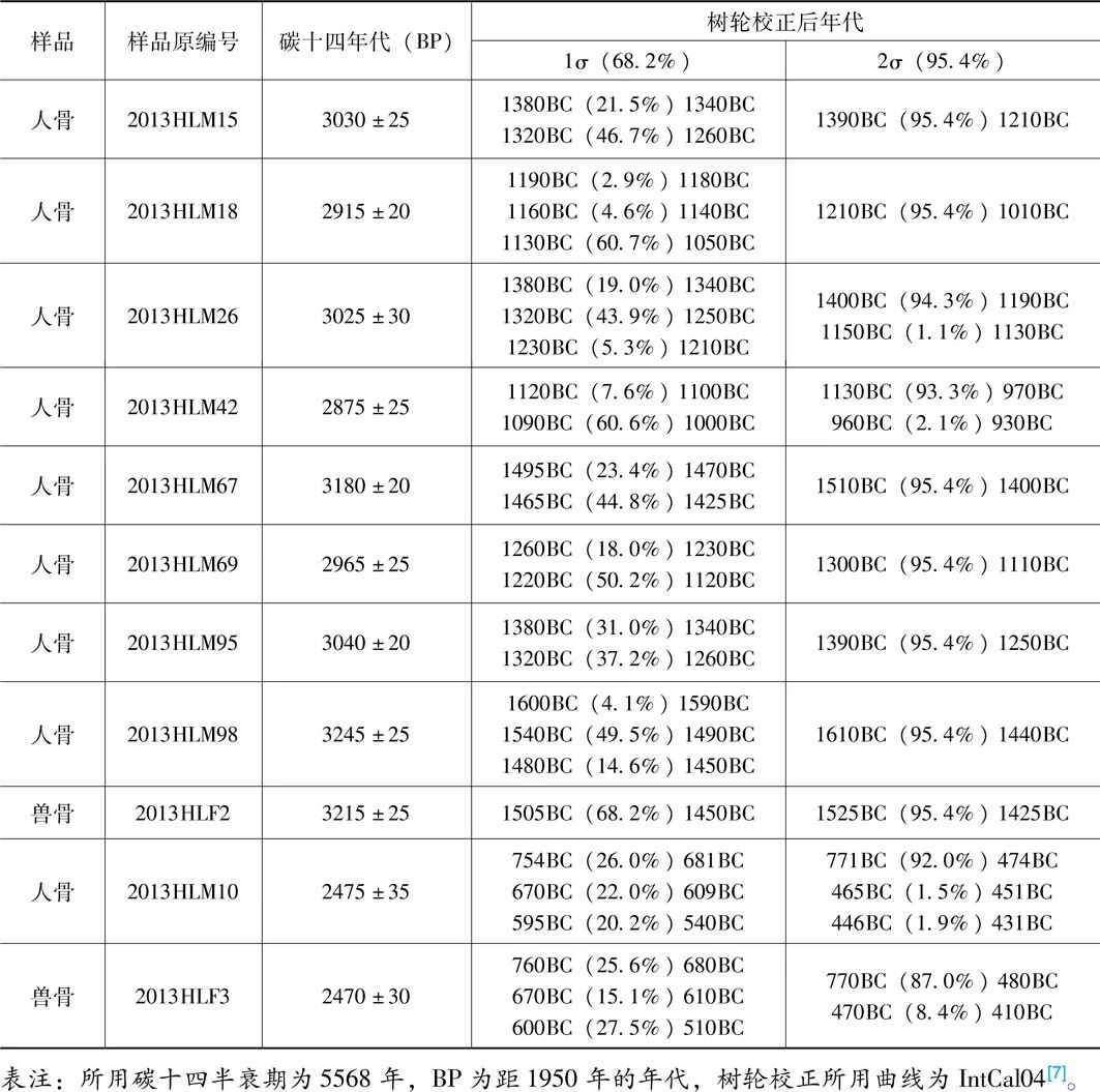 该遗址所有墓葬除一座为仰身直肢葬外,其余均为侧身屈肢葬。王远之对柳树沟墓地做了考古学文化研究,认为柳树沟墓地出土陶器和铜器均与哈密天山北路文化、焉布拉克文化等周边文化关系密切,显示出较强的新疆东部青铜文化因素。[6]综合考古发掘地层、考古类型学分析及碳十四测年结果,柳树沟墓地分为早晚两期。早期地层主要流行石圈墓,随葬单耳罐、单耳壶、细长的单耳杯和矮胖的垂腹杯,彩陶的数量较少,纹饰简单;碳十四测年结果(表1)经树轮校正后,F2及M15~M98等柳树沟早期遗址及墓葬的年代约为1610BC~970BC。本次分析样品的墓葬主要出自早期地层,年代主要集中在1400BC~1100BC,与哈密天山北路文化四期七、八段处于同一时期。晚期地层多为石堆墓,以单耳钵、腹耳壶等器型为主,彩陶逐渐增多,纹饰风格与焉布拉克墓地彩陶纹饰接近,在年代较晚的墓葬中还出土有铁器残渣。F3及M10等柳树沟晚期遗址墓葬的年代约为771BC~474BC,与哈密地区的焉布拉克墓地和黑沟梁墓地属于同一时期。