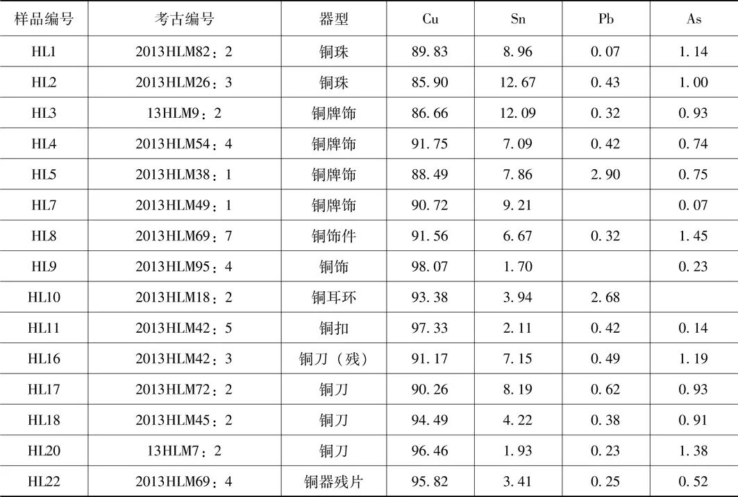 所取样品经过除锈等预处理后,利用扫描电镜能谱仪(SEM-EDS)进行成分分析。SEM-EDS分析所用仪器为配备美国布鲁克公司Quantax70能谱仪的Hitachi TM3030扫描电子显微镜。除锈过程中发现本次所取的23件样品中,有8件样品锈蚀情况较为严重,因此,本文仅分析了15件铜器的合金成分,结果见表3。表现为:多数器物为Cu-Sn二元合金,分别为7件饰品、3件兵器和1件铜器残片,合计11件,占总数的73%;另外有两件Cu-Sn-Pb三元合金,其铅含量均在2%~3%之间,占总数的13%;还有两件含有少量Sn、As的红铜器物,占总数的13%。此批铜器具有一个共同的特征,即除一件铜耳环2013HLM18:2之外,所有器物中均含有一定量的砷。少量的砷可能来自含砷铜矿。
