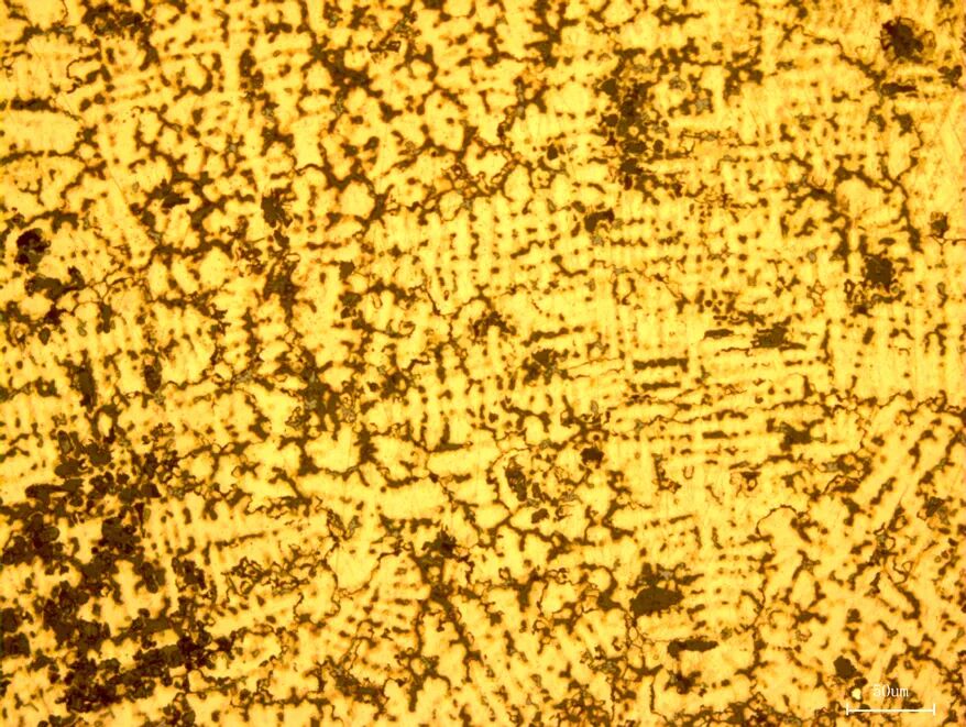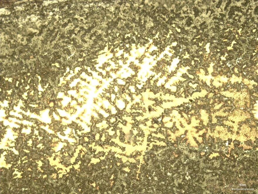 金相显微分析结果表明,这两件器物均为铸造成型。其中2013HLM42:3铜刀(残)为典型的树枝晶偏析组织,基体存在一定程度的腐蚀,边缘可见树枝状α固溶体已腐蚀成灰黑色,在中心合金本体保存较好区域可见少量灰色岛屿状(α+δ)共析体分布于树枝晶间;2013HLM82:2铜珠亦为典型的α固溶体树枝晶偏析铸造组织,且整体保存状况较好。