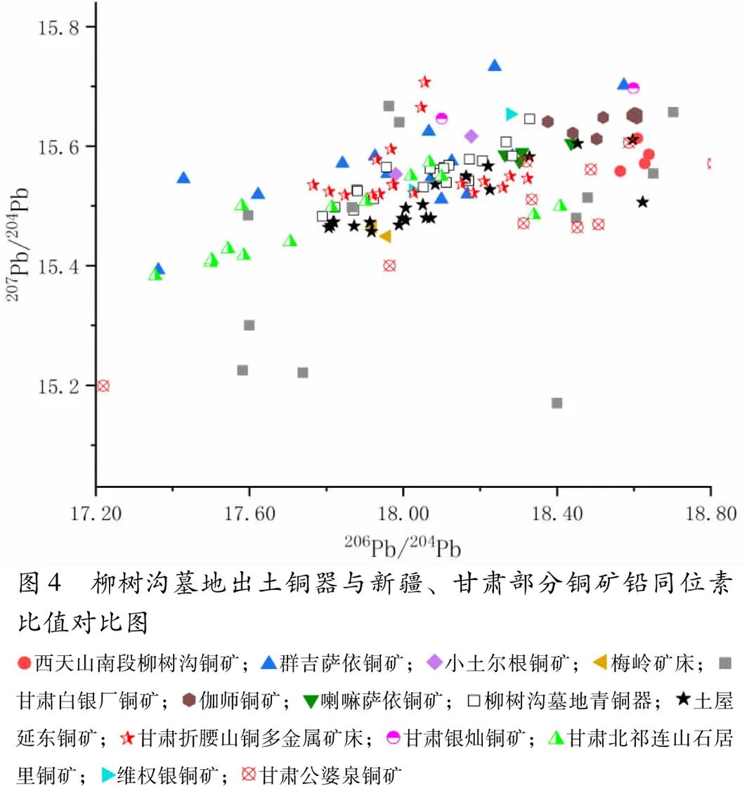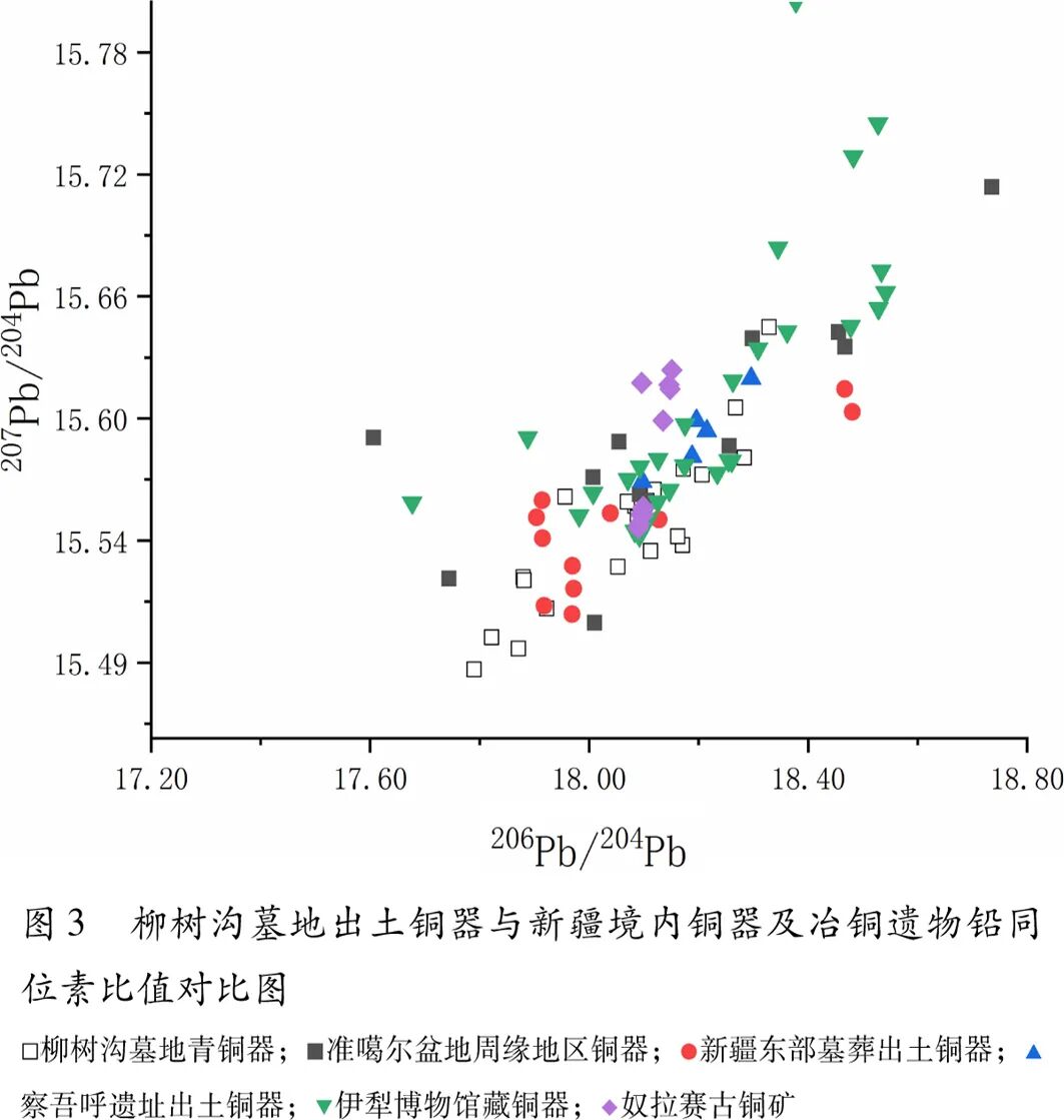 进一步对比柳树沟墓地出土青铜器与新疆境内已发表铜器及冶铜遗物的铅同位素数据可知(见图3),柳树沟墓地出土青铜器的铅同位素比值有相当一部分与伊犁州博物馆藏铜器和奴拉赛古铜矿遗址出土冶铜遗物铅同位素比值重叠,也存在一个与新疆东部哈密天山北路墓地出土铜器青铜器同位素比值完全重叠的样品,而与察吾呼遗址和准噶尔盆地周缘的铜器基本没有重叠。
