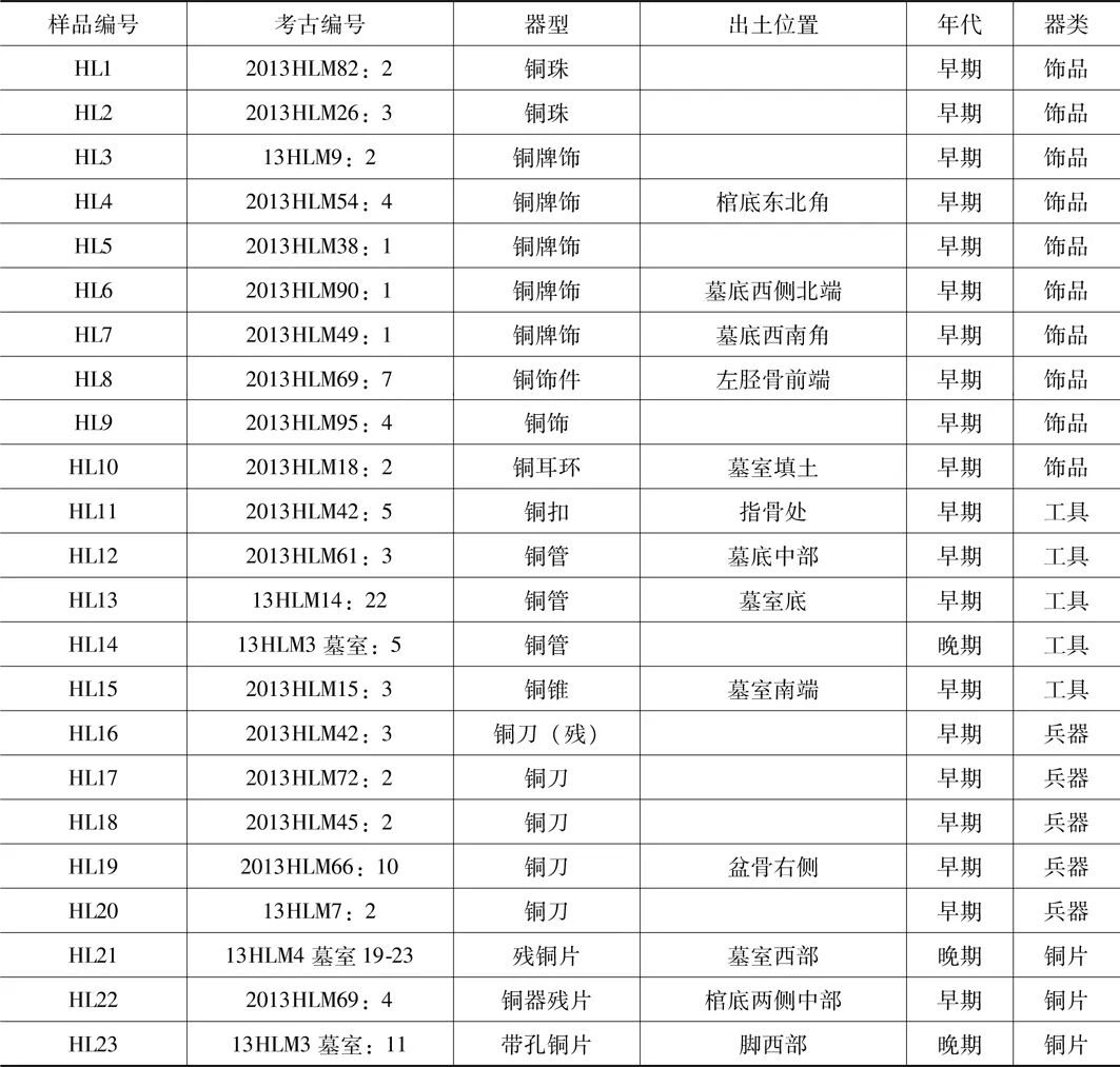 本研究所取样品为来自哈密柳树沟墓地出土的23件青铜器物,其中3件来自晚期墓葬,其他20件均来自早期墓葬。按用途分为饰品(10件)、工具(5件)、兵器(5件)和不明用途的残片(3件)。样品信息见表2。