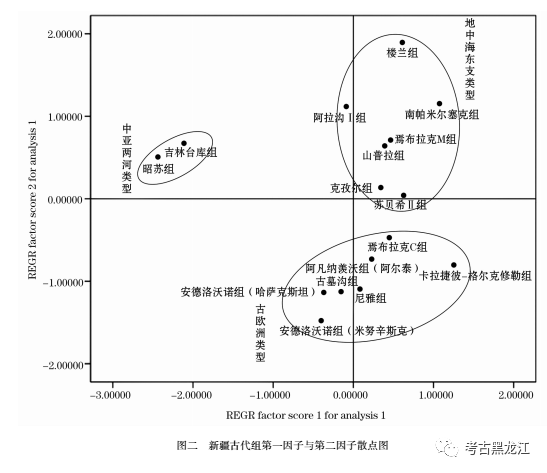 为进一步探讨楼兰组和周围古代组之间的相互关系,我们采用因子分析的方法对楼兰城郊古墓与周围地区遗址进行多元统计分析(表二)。因子分析以求用少数几个因子反映较为复杂的数据信息,是将相同本质的变量归为同一个因子的方法,将主成分转化为因子并计算得分。