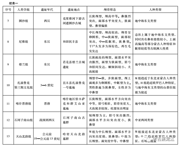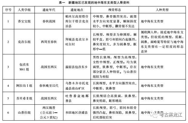 1980年,新疆文物考古研究所发掘了楼兰城郊古墓,该墓地位于楼兰古城东北4.8千米的两个台地上,墓葬多为长方形土坑竖穴墓,对楼兰城郊B台地一号汉墓中出土木材进行的碳十四测年表明,绝对年代为距今约2000年,相当于历史上东汉初期。墓葬出土带有铭文的星云纹和连弧柿蒂纹铜镜属于西汉中晚期典型风格,还出土了大量精美的丝织物,这些织物的纹饰特征具有明显的汉代风格,部分织锦的幅边有佉卢文题记。同时缂毛织品中的晕间拉绒缂毛以石榴花为主体,是典型的古代中亚风格。可作为断代依据的两枚五铢钱形制与满城汉墓Ⅰ、Ⅱ型五铢钱相似,铸造年代应为汉武帝后期。从遗址位置和文化特征看,此墓地应可代表楼兰古国时期遗存。韩康信对该墓地采集的6具头骨(男性3女性2未成年1)进行形态特征分析显示,其中5具人骨具有高长颅、眉突强烈、鼻凸起强烈等特征,1具具有中颅型、眉突较弱、面型较阔、鼻根低、鼻骨突起弱等特征。除后1具归入蒙古人种外,其余5具可确定为欧罗巴人种类型,虽然这一组人骨资料数量较少,但仍可确定这一人群主要由欧罗巴人种组成,5具欧洲人种头骨具有长狭颅、高狭面、水平方向强烈突出、侧面方向突度为超平颌型、额倾斜程度中—小或中—高的眶型、犬齿窝较弱、后枕部突出明显等特征。韩康信通过对城郊古墓两具男性头骨的测量指数与帕米尔塞克类型头骨基本形态进行比较,发现很多共性,差异性较小,因此,可以认定楼兰城郊古墓的主体人群与帕米尔塞克人属于相同的人类学类型,即地中海东支类型。刘宁对新疆境内的遗址进行了全面梳理,用以讨论包括楼兰在内的四个古国人种构成问题,整理了早期学者的研究成果,阐明新疆地区地中海东支类型遗址的分布情况,对不同地区蒙古人种的混入现象做出较为系统的论述,并对楼兰人的流向问题表明看法,为我们的研究方法提供了思路。考虑到楼兰古国人骨的人种主体成分已确认,为探讨楼兰地区这一人种的来源,笔者整理了新疆地区所有涵盖地中海东支人种成分的考古遗址。包括塔里木盆地南缘的香宝宝组、山普拉组、圆沙组、尼雅组、扎滚鲁克第三期文化组、石河子南山组、天山北路组、喀什晋唐组;塔里木盆地北缘的克孜尔组、包孜东M41组、阿拉沟Ⅰ组、苏贝希Ⅱ组等。现整理出新疆地区不同时期地中海东支类型材料分布情况(图一;表一)。