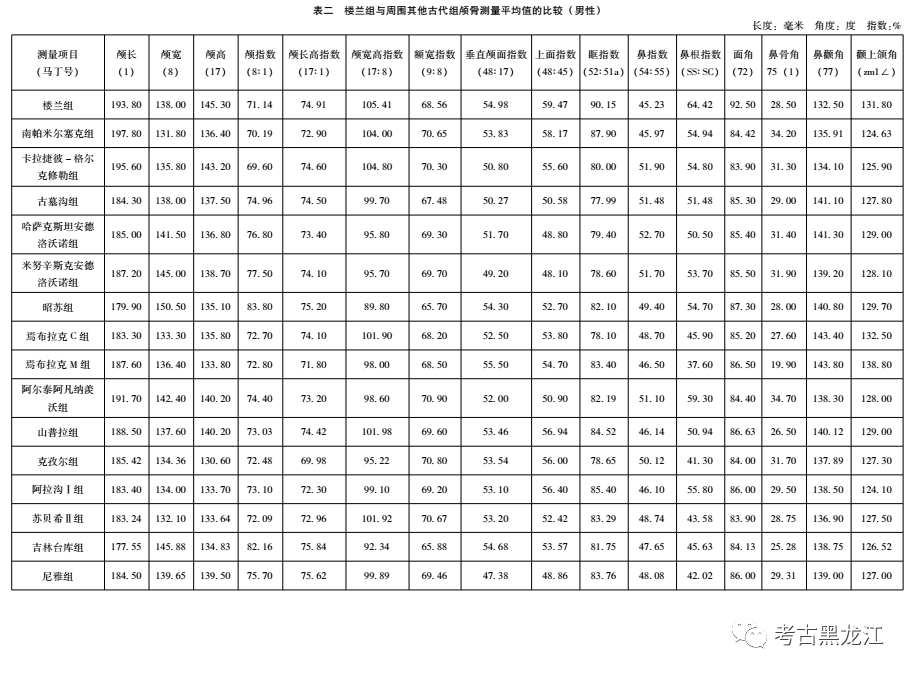 需要注意的是,古墓沟、楼兰铁板河和小河三处青铜时代人群普遍具有长狭颅、面相对低宽、眉弓和眉间突出强烈、多阔鼻型和低眶等特点。其中,面部低宽、鼻突显著、颅高颅长值较大、额较后斜等原始特点属古欧洲类型特征。同南西伯利亚、伏尔加河下游地区、中亚居民都具有原始欧洲人特征。小河墓地的分子生物学研究表明,小河居民是一个西部和东部的混合群体,最早的混合可能在西伯利亚南部,考虑到小河墓地的文化特征与公元前2000年在俄罗斯南部草原、哈萨克斯坦和中亚西部出现的安德洛诺沃或阿凡纳羡沃文化相似,此结论与韩康信对此人群颅骨类型学分析结果一致。孔雀河青铜时代考古学文化主要来源于米努辛斯克盆地的阿凡纳羡沃文化,他们和建立楼兰国的地中海东支类型人群有着不同的来源和路线。