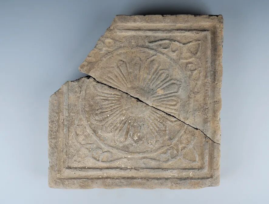 另外,在北组中室东侧扰坑(H442)中,清理出大量莲花纹方砖(图11),并有若干掌印砖、刻划棋盘的青砖、素面青砖和板瓦,制作较为精细,为典型的唐代建筑构件。该扰坑为晚期破坏寺院遗址时形成,内部发现的唐代建筑构件,可能为叠压于景教寺院遗址之下的唐代建筑所用,被晚期扰坑破坏翻出并废弃。据此判断在目前清理的景教寺院遗址之下,尚有规格较高的唐代建筑,其性质有待后续发掘判定。