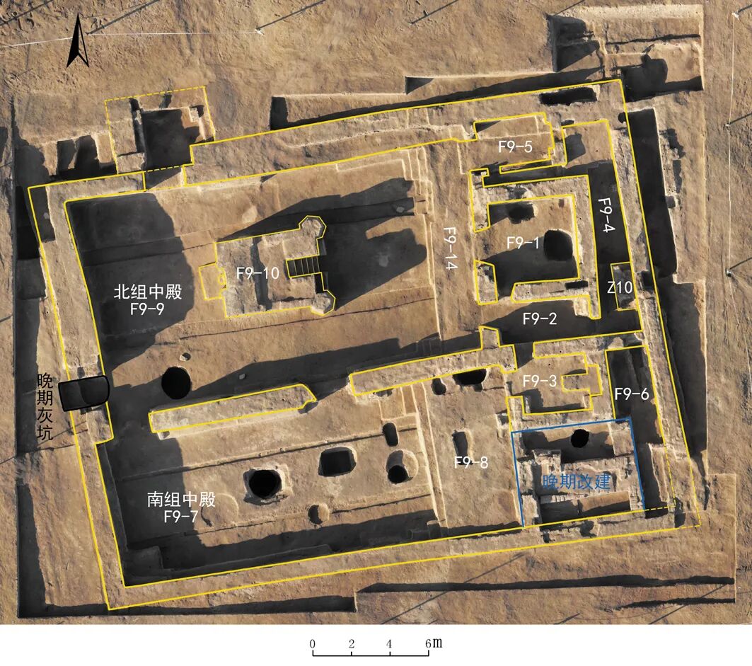 南组建筑整体规模小于北组,东南部晚期改建较为严重,包括中殿(F9-7)、祭台(F9-8)、北室(F9-3)、后廊(F9-6)等结构。