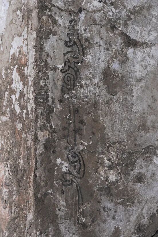 中室(F9-1)平面近正方形,东西长约4.2米、南北宽约4米。西墙门道居于正中,呈八字形,外窄内宽,约1.4~1.8米。南墙西侧开有1小门,可连通南室(F9-2),同样呈八字形,宽约0.6~0.8米。西墙南侧上部有一半圆形壁龛,顶部已坍塌,宽约0.2米、深约0.2米,龛内有烟熏痕迹。北墙中部有一处规模较大的壁龛,宽约0.6米,深约0.5米,受到晚期人为破坏,原始结构已不清晰。室内墙面和坍塌堆积中发现较多的壁画遗存,其中西墙北侧壁画保存状况较好,内容主体为一个身着红衣人物的下半身,周边绘制有多组人物形象,包括男性和女性。北墙东侧下方同样发现一组人物形象,绘制线条较为简单,均为统一的男性形象。室内东侧和北侧有2处晚期盗坑,推测可能于寺院受到人为破坏废弃时形成。