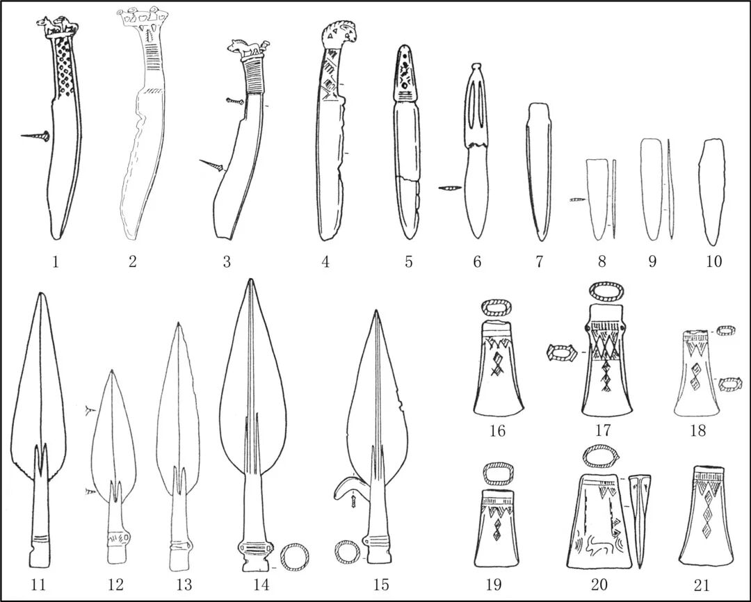 1-4刀;5-10匕首;11-15铜矛;16-21空首斧(4出自叶鲁尼洛,1、5-7、11、16、17出自塞伊玛墓地,2、8、9、12、13、18出自图尔宾诺墓地,其余均出自罗斯托夫卡墓地)
