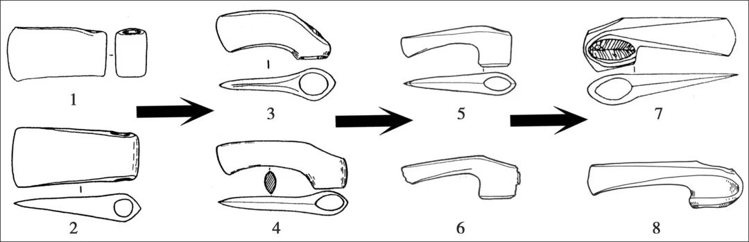 第二组器物在周围其他文化中拥有广泛的分布,这些器物包括有銎战斧(图二)、有柄的匕首、锥和凿等器物,这些青铜器在塞伊玛—图尔宾诺遗存中都有少量发现,但在其南部的其他文化中更为流行。尤其是有銎战斧,这是一种具有砍杀功能的长柄武器,在塞伊玛—图尔宾诺遗存中发现的数量相对较少,可能是因为塞伊玛—图尔宾诺遗存中主要的长柄武器是具有刺杀功能的山字形脊铜矛。相比之下,有銎战斧在草原地区的木椁墓和安德罗诺沃文化区中流行更为广泛。笔者曾对欧亚草原、中国北方和新疆的有銎战斧进行了专门研究,[10]并对战斧的发展演变过程进行了分析,我们发现塞伊玛—图尔宾诺遗存中出土的有銎战斧均为欧洲系统的有銎战斧,这种战斧在草原地区有较为明显的演变(图三)。